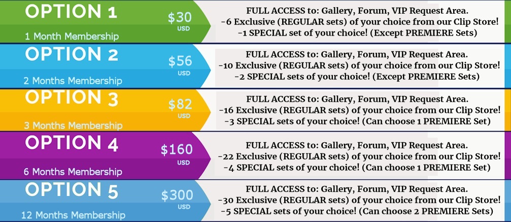 2.- Once you make your payment, please confirm it sending an email to: -Desired username -Desired password -Email address to use on the site -And the exclusive sets you choose to get for free from our CLIP STORE. You will get your access very soon after.